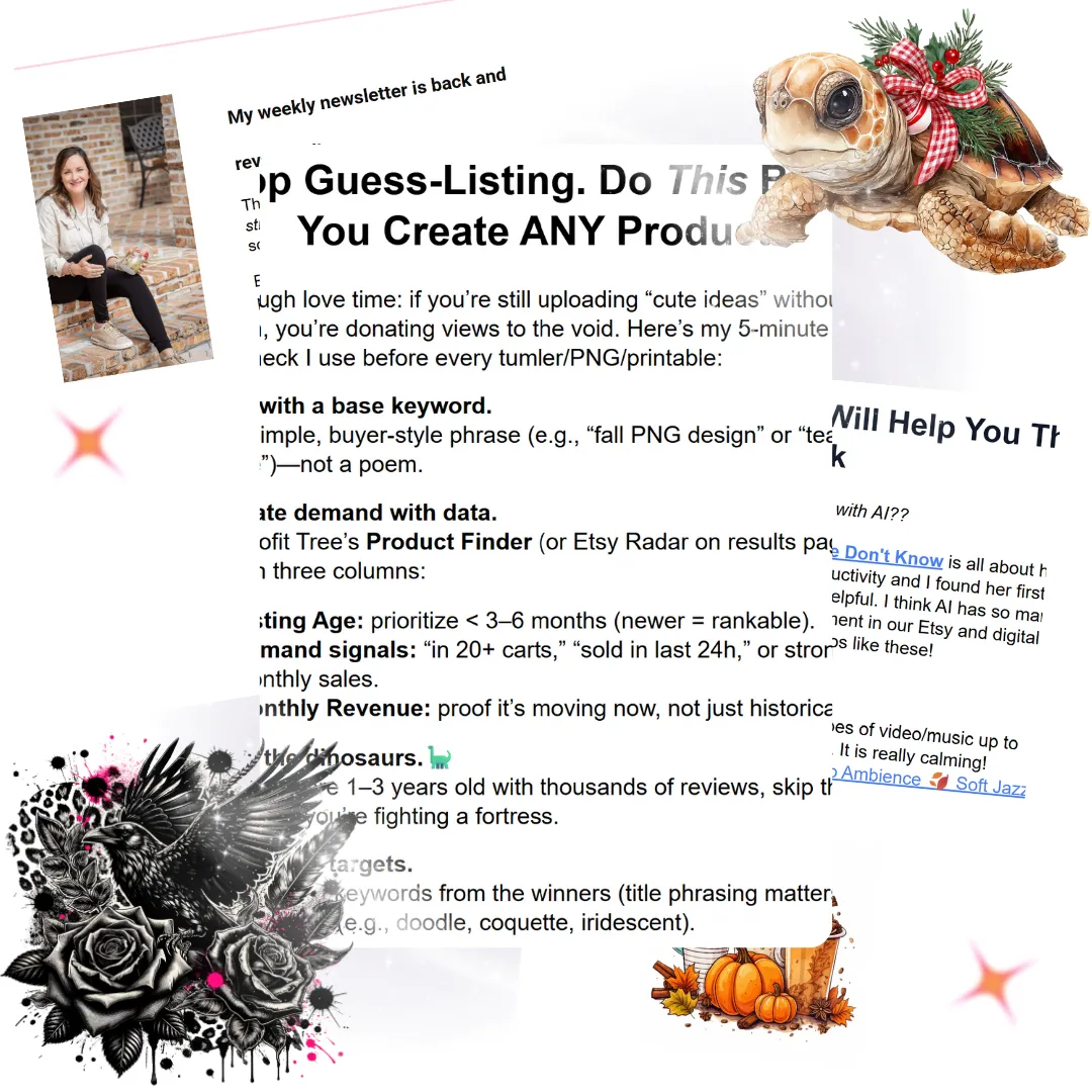 Every week, you’ll get bite-sized Etsy + digital product tips, AI prompts, lessons pulled straight from my coaching calls and community chats, and brutally honest insights you’ll never see in a YouTube video or IG post.